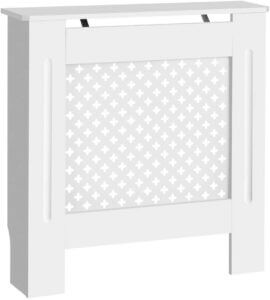 Conçu en panneaux de fibres de bois MDF, il garantit robustesse et durabilité. Visuellement, on dirait une commode moderne et élégante qui ferait tout son effet dans un salon ou une très grande chambre soigneusement décorés. Non seulement décoratif mais également pratique, ce cache-radiateur peut vous permettre de fignoler votre déco en jouant le rôle d’étagère. En effet, vous pourrez y déposer des cadres photos ou des bibelots si vous le souhaitez !