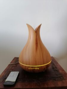 Pour être totalement transparente avec vous, il s’agit du modèle que j’ai chez moi. Je l’utilise donc au quotidien. J’ai choisi ce diffuseur d’huiles essentielles ultrasonique car il répond aux caractéristiques que je recherchais. C’est-à-dire un modèle qui non seulement diffuse des huiles essentielles mais qui en plus émet une lumière douce. Autre spécificité qui m’a séduite est son bruit d’eau qui est vraiment très apaisant. Son côté brumisateur avec un effet brouillard plus ou moins intense est également très agréable. Reposant, ce diffuseur permet de créer une ambiance de détente que ce soit pour travailler, faire du yoga ou se préparer au sommeil. D’une utilisation simple, sa télécommande permet de l’actionner à distance (jusqu’à 3 mètres) et de choisir le type d’éclairage souhaité.