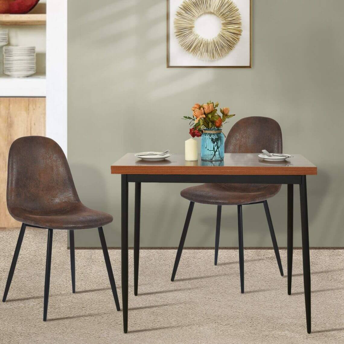 Voici une table à manger au format carré. Ses dimensions fermées lui permettront de jouer le rôle de console ou de bureau. Si vous l’ouvrez, vous pourrez partager un repas à 4. Son plateau en MDF s’offre une finition bois foncé et son armature est faite de métal noir. Je pense que l’on peut imaginer ce modèle dans un univers décoratif industriel. L’association des teintes bois rustique et métal noir s’y prête parfaitement, selon moi.