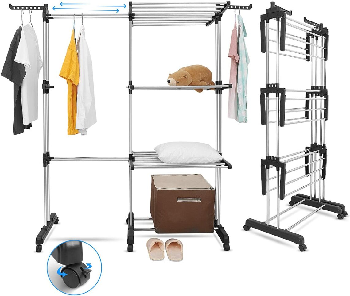 HOMIDEC Etendoir Linge, 4 Niveaux Grande Sechoir a Linge Pliable avec Roues, Acier Inoxydable Seche Linge Etendoir pour Intérieur et Extérieur, Gris