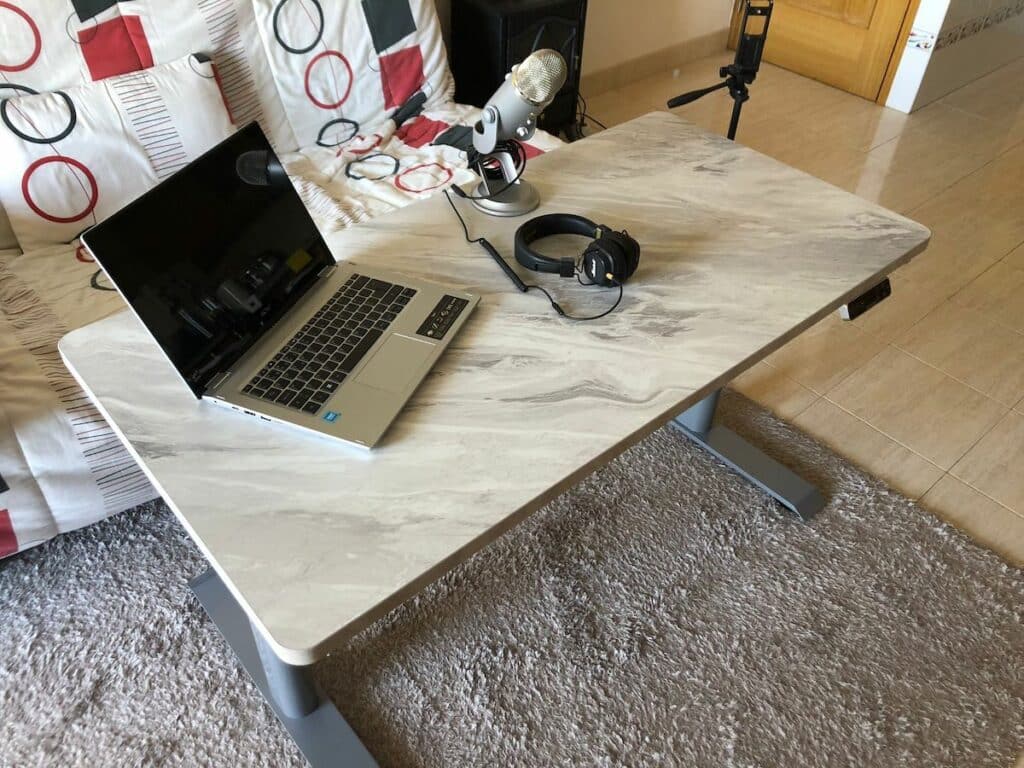 Comme vous pouvez le voir, le bureau descend très bas, c’est pour moi très utile car je suis parfois en train de faire des vidéos depuis mon clic clac , ce qui me permet de mettre tout mon équipement de bureau au niveau de l’assise, et ça c’est juste génial.